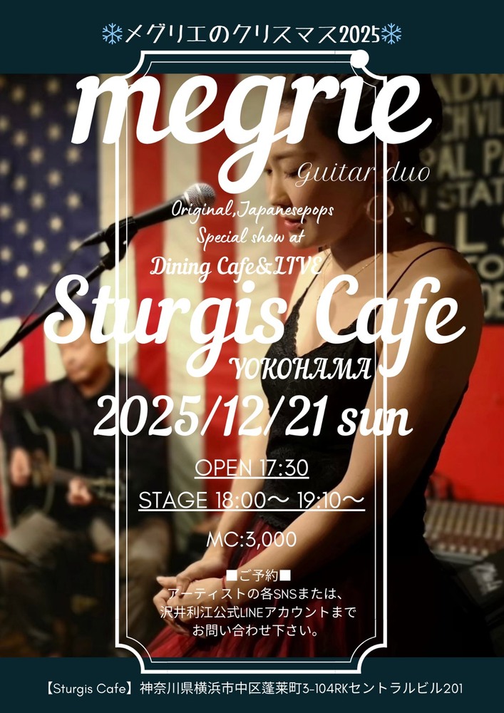 @関内『Sturgis Cafe ーAmerican dining cafe & Barー』 【LIVE Schedule】 2025/12/21(日) Sturgis Cafe 地図を表示 2025.12.21(日)@関内『Sturgis Cafe』 「メグリエ」 @関内Sturgis Cafe 17:30オープン 18:00スタート 関内『スタージスカフェ』 URLをコピーする 報告する